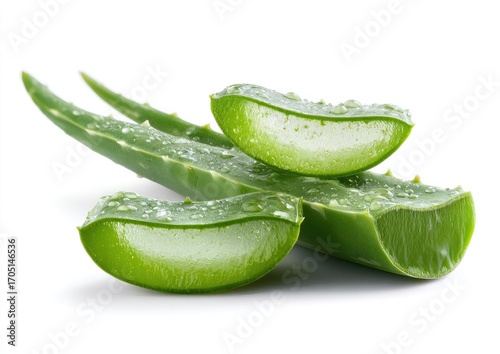 Close-up of aloe vera slices and leaves. Fresh, vibrant green aloe vera slices with water droplets, isolated on white background. Healthy, natural, and botanical