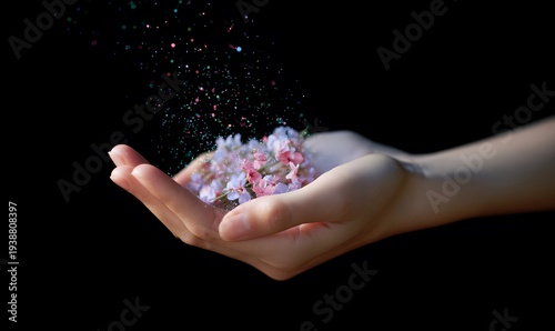 Close-up of an elegant woman's hand gently creating a small galaxy of diverse miniature flowers and light particles in an open palm
