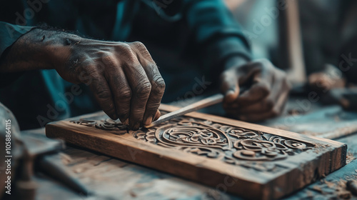 Close-up of artisan's hands meticulously carving intricate floral design on wooden plank, showcasing traditional craftsmanship in workshop
