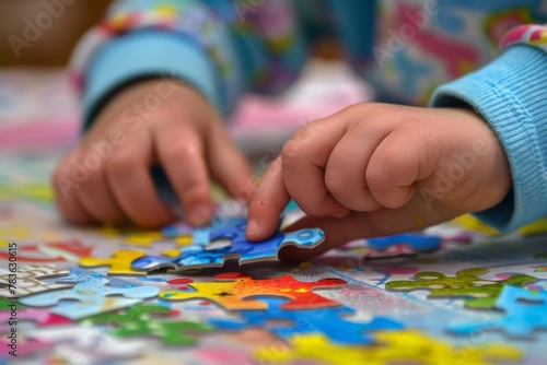Close-up of Autistic Child's Hands Sorting Puzzle by Color and Shape, Reflecting Methodical Approach to Chaos and Order.