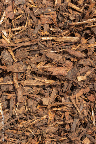 Close-up of bark mulch chippings background backdrop. Used by gardeners for weed control and protecting plant roots from frost.