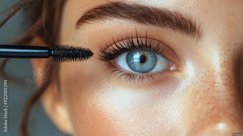 Close-up of beautiful woman's eye applying mascara for glamorous look cosmetic beauty makeup product styling