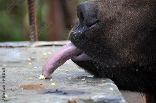 Closeup of big hungry caged brown bear reaching out with its tongue for bread crumbs