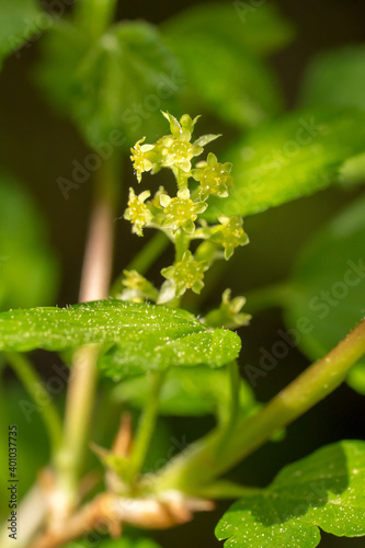 Closeup of blossoms of a Mountain Currant bush (Ribes alpinum)