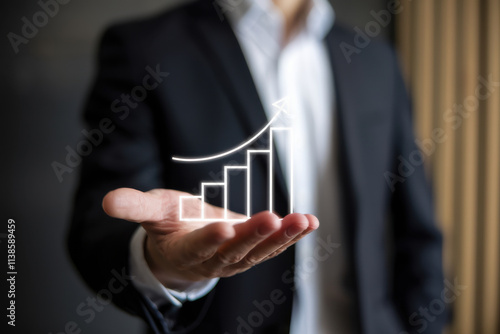 Close-up of businessman holding glowing bar graph with an upward arrow indicating financial growth and success in a corporate environment