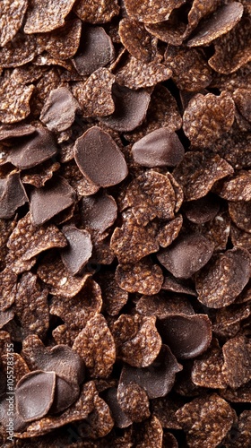Close-up of chocolate cereal flakes and dark chocolate chips mixed together, creating a rich, textured background perfect for food photography or packaging design.