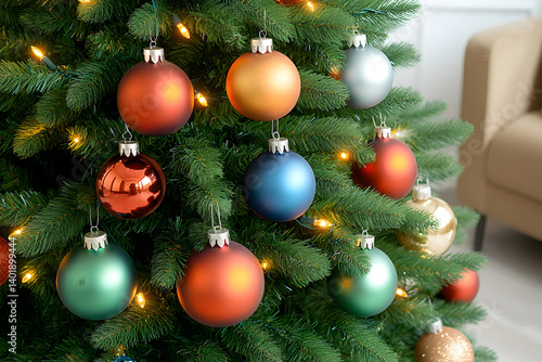 Closeup of Christmas Tree Decorated with Colorful Ornaments and Warm Lights