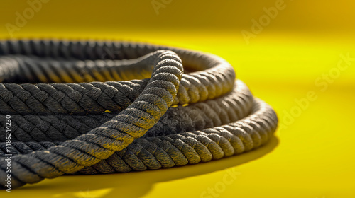 Close-up of coiled black crossfit training ropes on vibrant yellow background, ideal for fitness marketing, strength training visuals and gym advertisements