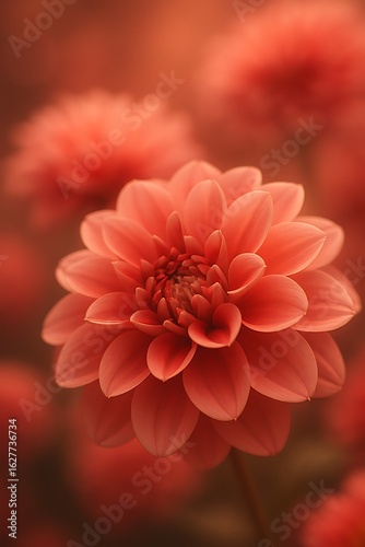 Close-up of coral red dahlia flower with soft focus, delicate petals in bloom