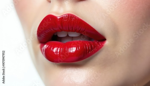 Close-up of crimson lips, stark white backdrop, white background, sensual, white