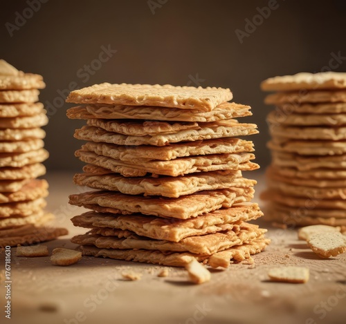 Closeup of crisp cracker stack, flaky layers, warm tones, flaky, golden