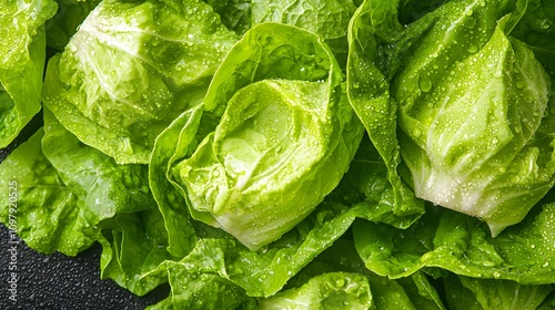 Close-up of crisp green lettuce leaves covered with water droplets, showcasing freshness, natural texture, and healthy eating.