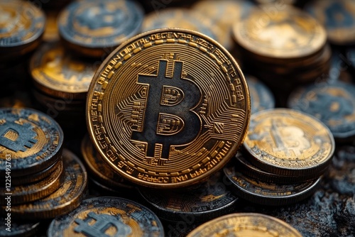 Close-up of cryptocurrency coins highlighting Bitcoin wallet details in focus