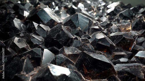 Close-up of dark,faceted crystals forming a rough texture, showcasing depth and geological formation. Represents power, strength, and the earth's natural beauty