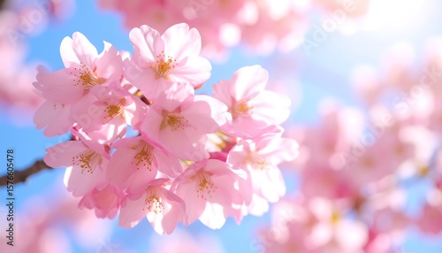 Close-up of delicate pink cherry blossoms against a bright blue sky