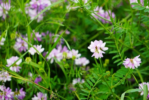 Close-up of delicate purple and white wildflowers blooming in a lush green meadow