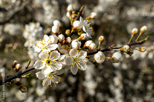 blossom, flower, bloom, spring, nature, tree, tree branch, cherry, plum, white, flower petals, bud, sunlight, fresh, floral, plant, closeup, natural, season, growth, pollen, beauty, delicate, botany, fragrance, background, outdoors, stem, garden, purity, vibrant, fruit farm, macro, blooming, bright, sky, seasonal, colours, new, tender, texture, sharpened, scenic, life, awakening, freshness