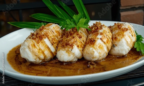 Close-up of delicious pan-seared scallops with a rich brown sauce