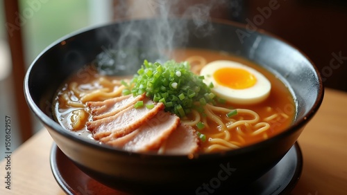 Close-up of delicious ramen with egg, pork, and green onions in a rich broth, styled for appealing warmth & texture., ultra detailed, 8k resolution, HDR, professional