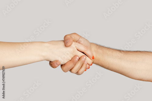 woman, man, hand, hi, hallo, handshake, bye, deal, adieu, agreements, congratulation, greeting, meeting, contract, communication, greet, partner, shake, success, trust, done, diverse, agree, touch, welcome, people, hostess, invitation, gesture, hospitable, sociable, job, offer, client, partnership, friendship, girl, female, arm, indoor, anonymous, white, unknown, grey background, isolated, person, showing, give
