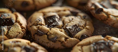 Close-up of fast food chocolate chip cookies showcasing detailed textures of the golden edges and gooey centers