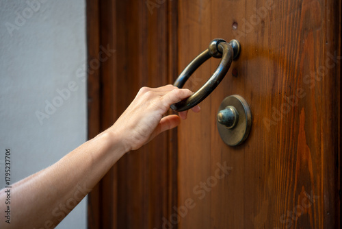 Close-up of female hand holding antique brass door knocker on old wooden door, traditional home entrance detail symbolizing hospitality and architectural heritage