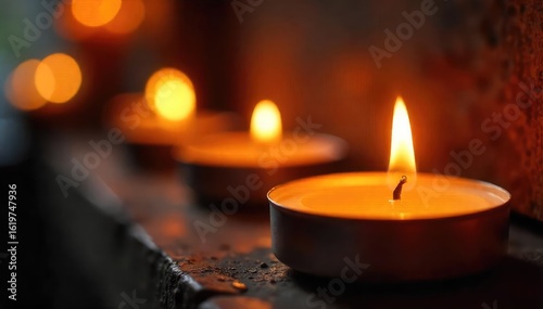 Close-up of flickering candle flames, warm yellow and orange light, soft focus background, romantic ambiance, glowing embers, wax melting, peaceful scene, serenity, home decor , energy, cozy, glow