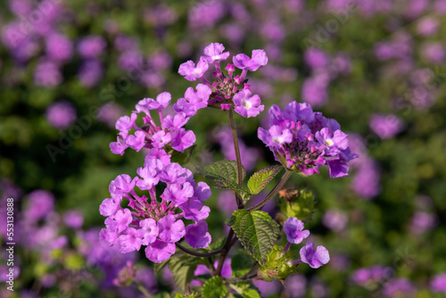 Closeup of flower clusters of Lantana in a garden in Italy in late summer