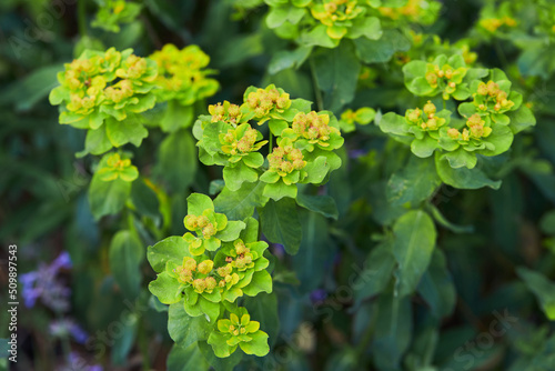 Closeup of flowers of greater cushion spurge, Euphorbia epithymoides 'Major' blooming in spring