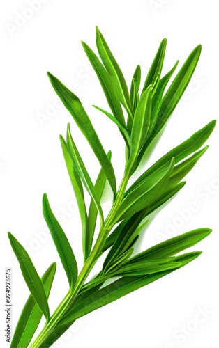 Close-up of fresh green rosemary sprig on a white background, highlighting its vibrant color and detailed texture.