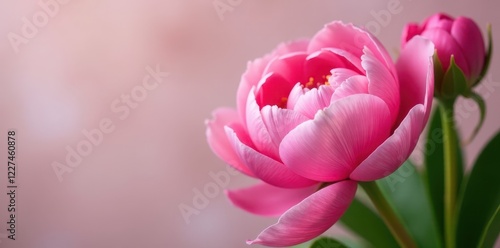 Close-up of fresh pink peony stems and rose buds, pink peonies, flower details, blossom details