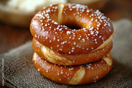 Close-Up of Freshly Baked Salted Pretzels Stacked on Burlap for Rustic Bakery Theme