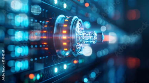 Close-up of futuristic server hardware in data center with glowing blue and orange lights, representing advanced technology and information flow.