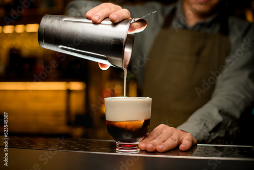 close-up of glass in which hand of bartender carefully pours whipped cream from shaker