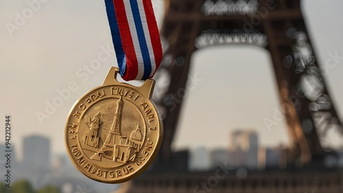 Close-up of gold medal against hazy backdrop of the Eiffel tower. idea for the Olympic Games.