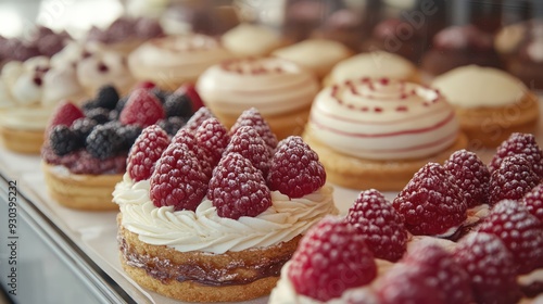 Close-up of gourmet pastries in a akery display case, showcasing the intricate details of dessert creation.