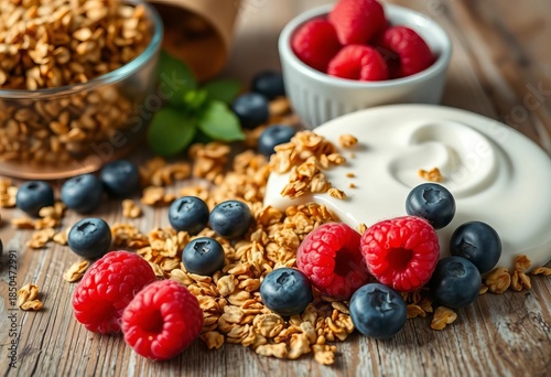 Close-up of granola, yogurt, raspberries, and blueberries on a rustic table, close-up, energy