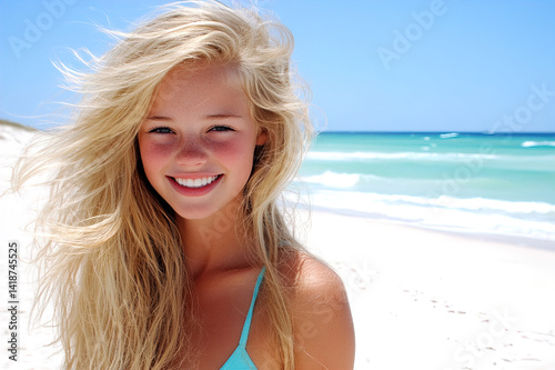 Close-up of hair lifted by beach wind, smiling girl staring at bright, distant horizon