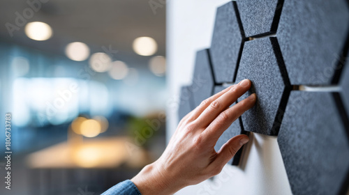 Close-up of hand touching hexagonal acoustic panels on wall in modern space with blurred background
