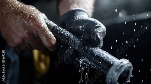 water, hose, nozzle, cleaning, rinse, wet, hand, glove, droplet, spray, pressure, detail, closeup, industrial, work, men at work, man, male, person, job, task, equipment, tool, maintenance, repair, service, industry, fluid, liquid, splash, stream, flow, dark, background, texture, metallic, grey, black, professional, careful, precision, safety, gear, supply, power, strong, grip, handle