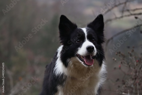 Close-up of Happy Border Collie Outside in Gloomy Nature. Smiling Black and White Dog Outdoors.
