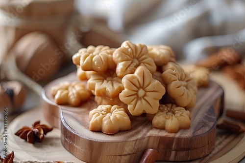Closeup of homemade walnut shaped cookies with boiled condensed milk on a wooden board