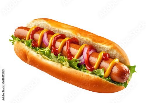 Close-up of hot dogs with toppings, American street food concept, hyper-realistic, isolated on white background