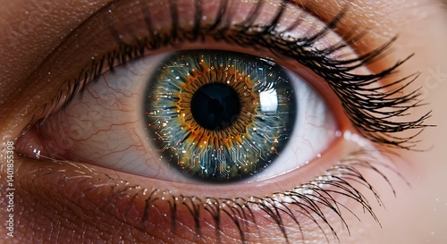 Close-up of human eye with futuristic digital overlay. Generative AI image