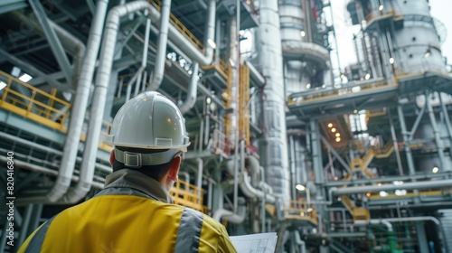 close-up of industrial pipes of oil refinery, back of engineer, technician, reading drawing, drawing, industrial engineering, blueprint, industrial background.