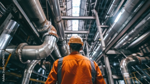close-up of industrial pipes of oil refinery, back of engineer, technician, reading drawing, drawing, industrial engineering, blueprint, industrial background.