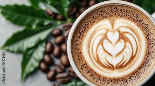 hot drink, latte, art, bean, cup, foam, milk, drink, beverage, caffeine, aroma, brown, hot, warm, delicious, morning, energy, fresh, roasted, leaf, plant, nature, detail, texture, pattern, design, food, tasty, sweet, crema, espresso, cafes, bar, shop, image, photo, picture, background, top, view, overhead