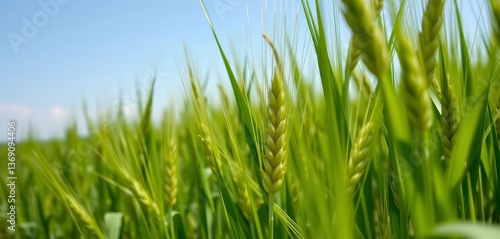Close-up of lush green wheat field swaying gently in the breeze, sunlight, organic