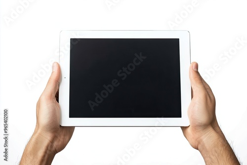Close-up of male hands holding tablet pc with blank screen isolated on white background
