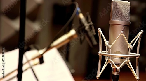 Close-up of microphone on stand in soundproof recording studio, positioned in front of script stand, symbolizing voice acting and audio production.